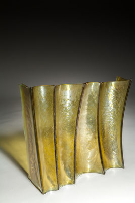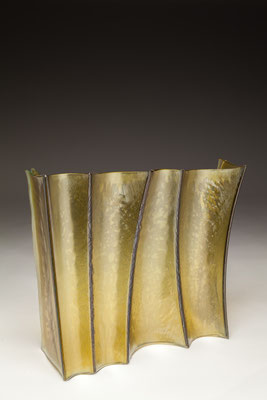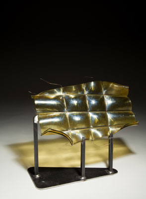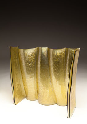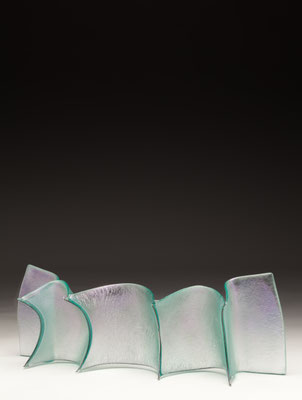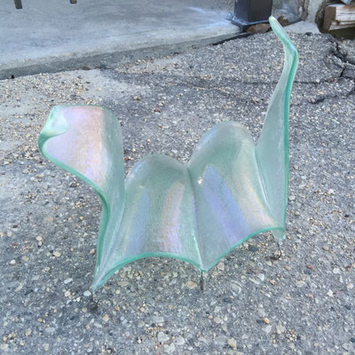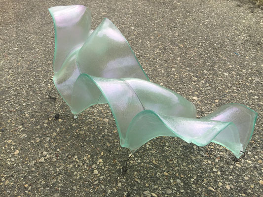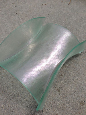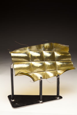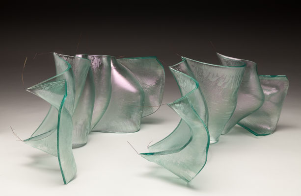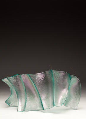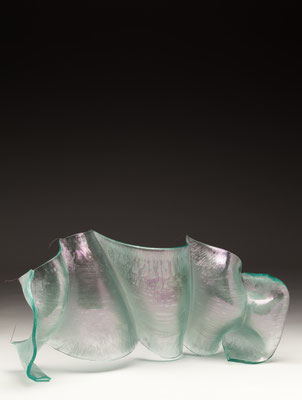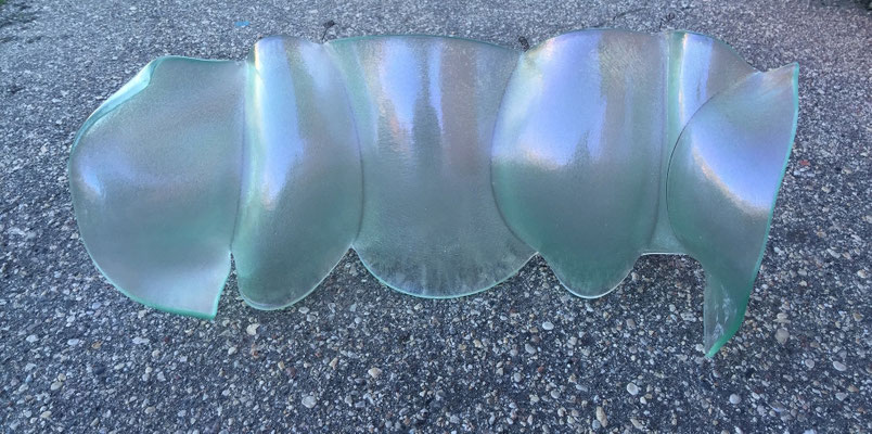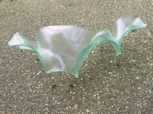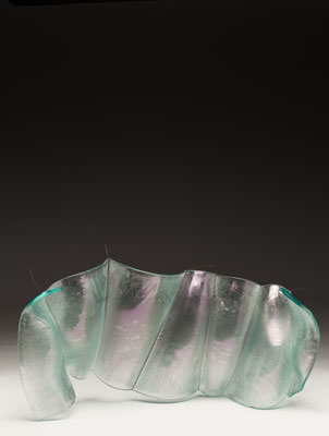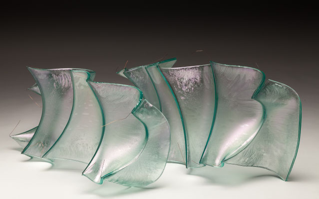temperatures. Specialized technical coatings on window glass can be manipulated so that they break up and iridize. When impeded by an embedded metal matrix, glass will move into a series of catenary arches which convey a sense of gesture and intention. I control the setup, but I can only loosely guide the result. The materials undergo a strange alchemy with the